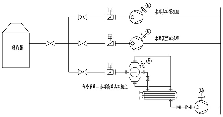 羅茨-水環(huán)真空機(jī)組是一種高效真空機(jī)組,廣泛應(yīng)用于化工、醫(yī)藥等行業(yè)的真空蒸餾、真空蒸發(fā)、脫水結(jié)晶等工藝流程中,但電廠凝汽器抽真空系統(tǒng)一直采用傳統(tǒng)的單一水環(huán)真空泵的運(yùn)行模式。近年來,隨著國家對(duì)節(jié)能環(huán)保認(rèn)知程度的不斷深入,高效、節(jié)能、挖潛已成為各大電廠關(guān)注的管理重點(diǎn),采用水環(huán)式抽真空系統(tǒng)加羅茨-水環(huán)高效真空機(jī)組的雙系統(tǒng)模式逐漸開始大量應(yīng)用,并取得了較好的節(jié)能效果。