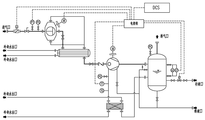 羅茨水環(huán)真空機(jī)組主要配置為:羅茨真空泵、SKA(2BE1)水環(huán)真空泵、級(jí)間冷凝器、工作水換熱器、氣水分離器,以及必要的儀器儀表、管路、閥門、機(jī)架等。