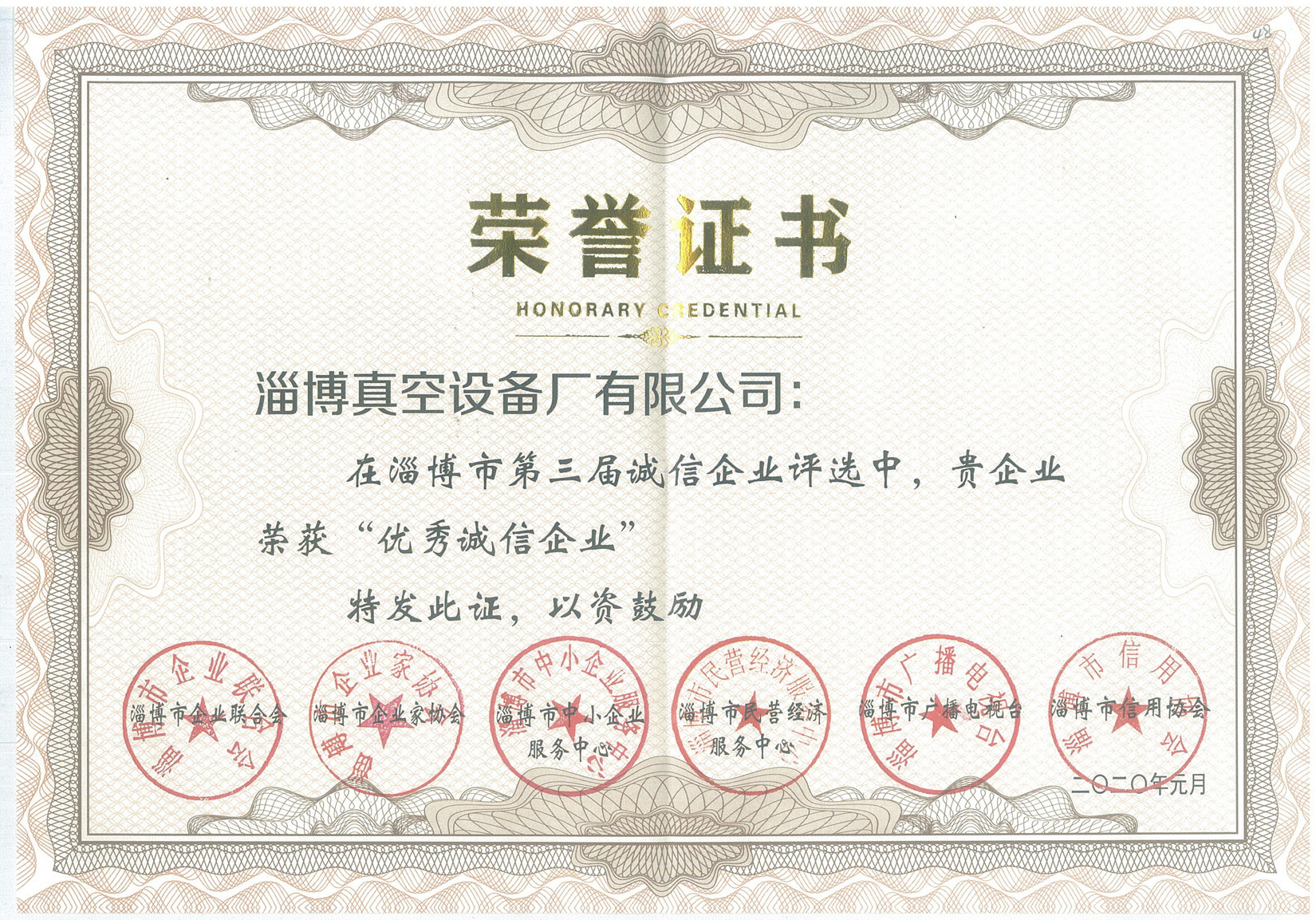 2020年1月9日,淄博市第三屆誠(chéng)信企業(yè)授牌儀式在山東齊盛國(guó)際賓館會(huì)議中心隆重舉行。在本次評(píng)選授獎(jiǎng)活動(dòng)中,淄博真空設(shè)備廠有限公司再次被評(píng)為“淄博市優(yōu)秀誠(chéng)信企業(yè)”。